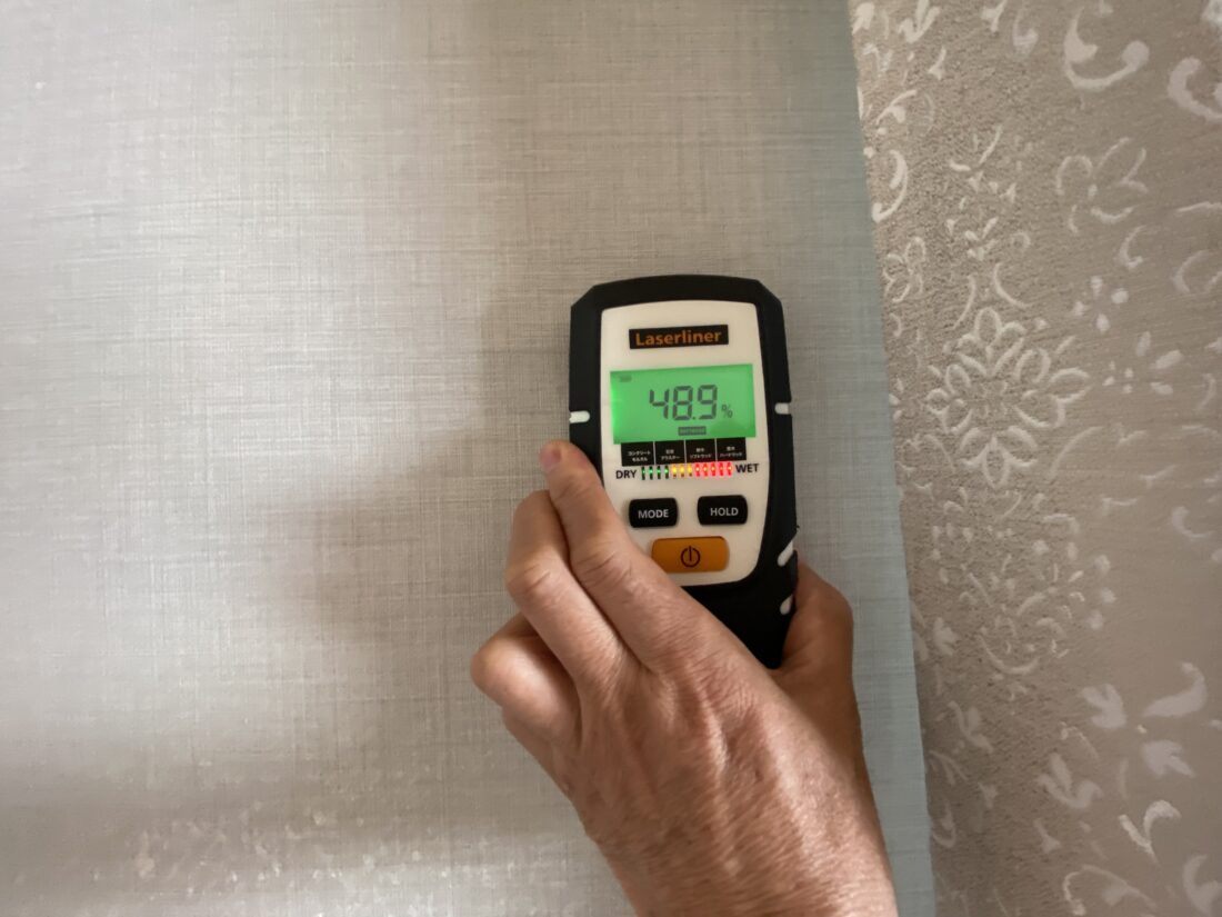 赤外線サーモグラフィで低温になった箇所の原因が水なのかを判断できます。また、赤外線サーモグラフィで検出できない微量の水分も調査できます。含水率の多少によって、結露の発生源を推測できることがあります。又、カビや腐朽菌が繁殖できる含水率になっているか?を確認します。