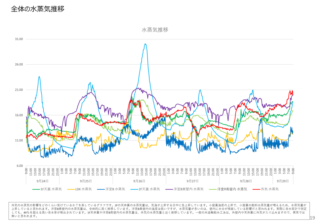 温湿度計によって、居住空間、床下、天井裏、壁内、外部など様々な空間の温湿度を測定して、水蒸気源を調査していきます。温湿度計によって、10分毎にデータを計測しますので、どこが水蒸気源となっておるかを推測できます。左のグラフは、温湿度データから水蒸気量の推移を計算したグラフです。