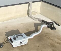 換気扇の風量が正常でも、天井裏で換気ダクトが外れていたり、破損していると、外へ排出されるはずの水蒸気が天井裏に排出され、結露、湿気、カビの原因となることがあります。この為、換気扇にスモークを吸い込ませて、天井裏に漏れが無いかを確認していきます。左の画像は、キッチンの換気扇にスモークを入れている写真です。