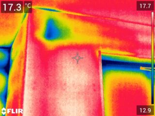 断熱材が無い箇所は、外気温度の影響を大きく受けるため、周囲と比べて温度差が生まれます。下の写真は、夏に撮影した赤外線写真です。赤外線画像では、半円窓の下が高温になっていますので、その箇所には、断熱材が無いことがわかります。